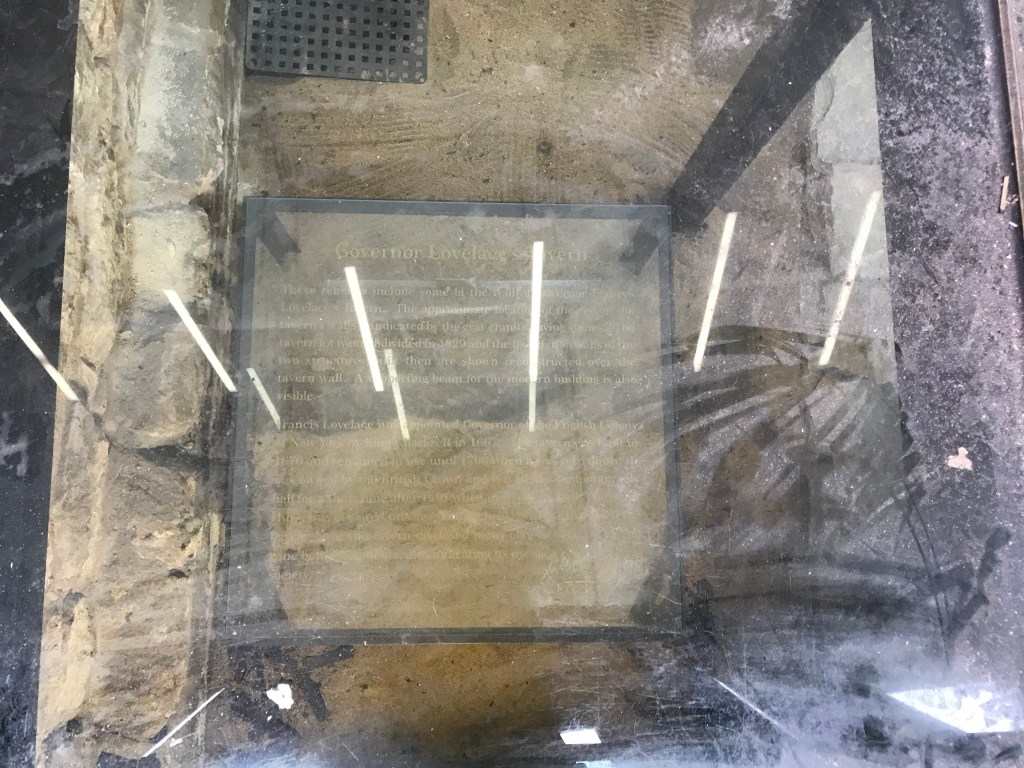Il s’agit de la ´Lovelace Tavern’, un bar au tout début de l’histoire du New York du 17ème siècle et construite donc sous la période coloniale néerlandaise, dans l’actuel quartier financier de Manhattan et propriété alors de Sir Francis Lovelace, deuxième Gouverneur anglais de New York.