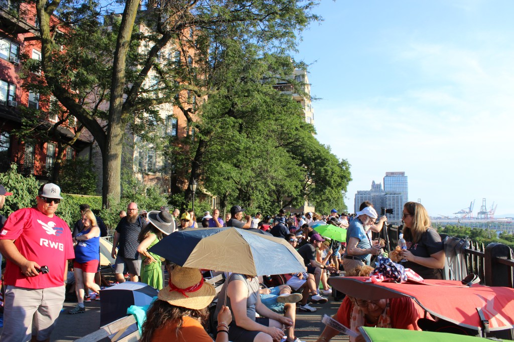 Pour le voir et comme j’ai assisté à mon 1er feu d’artifice le 4 juillet 2019, pour connaître les endroits où se placer, je me suis fiée au site de Macy’s qui conseillait de nous placer le long de South Street Seaport et pour ma part, je me suis positionnée 5 h avant sur Brooklyn Heights Promenade, qui était déjà occupée par des milliers de new yorkais avec leur couverture, glacière et parasol.