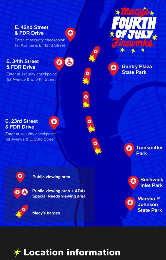 Cette année 2022, est marquée par son 46eme anniversaire ; sachez que ce show pyrotechnique dure environ 30 mn et qu’il est tiré à partir de 5 barges sur l’East River à partir de 21 h 30 (9:30 pm).
