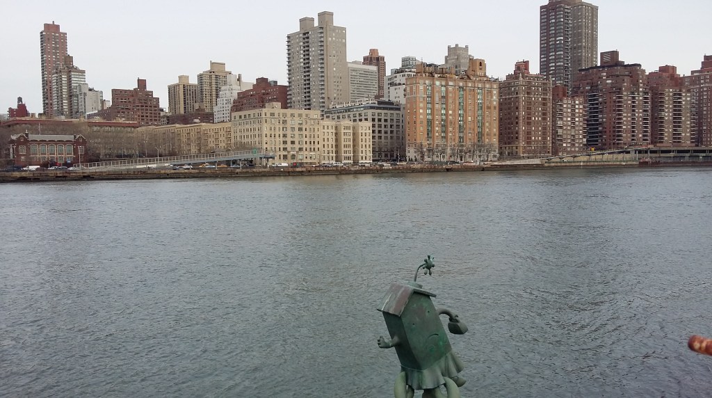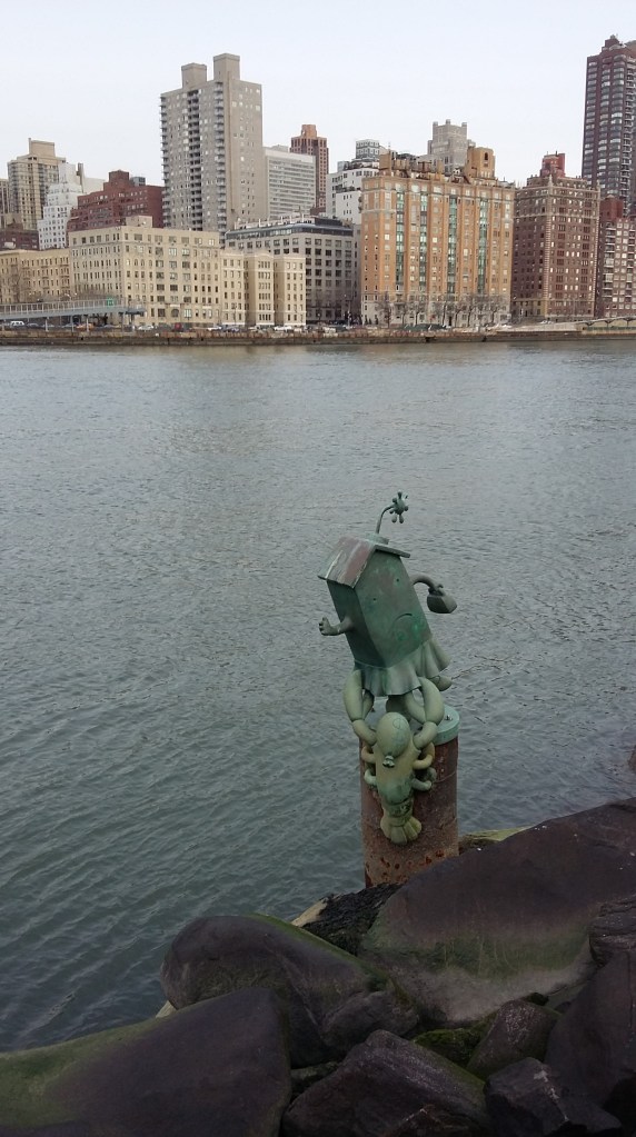 Après avoir dépassé le téléphérique, sur votre gauche, vous remarquerez à intervalle régulier de drôles de personnages en métal, posés au-dessus de l’eau. Il s’agit de sculptures réalisées par l’artiste américain Tom Otterness, installées en 1996 et intitulées «Le mariage de l’immobilier et de l’argent». Une jolie touche de poésie et d’humour puisque les sculptures font une déclaration aux complexes résidentiels de Roosevelt Island faisant face à ceux de ceux de Manhattan (Midtown East).