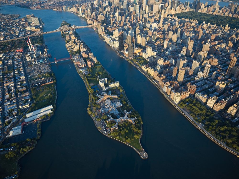 - Enfin, Roosevelt Island, rebaptisée ainsi en 1973, en l’honneur du Président Franklin Delano Roosevelt, est une île perçue comme « une ville dans la ville », avec ses près de 12 000 habitants, ses 3,4 km de longueur et 240 m de largeur.