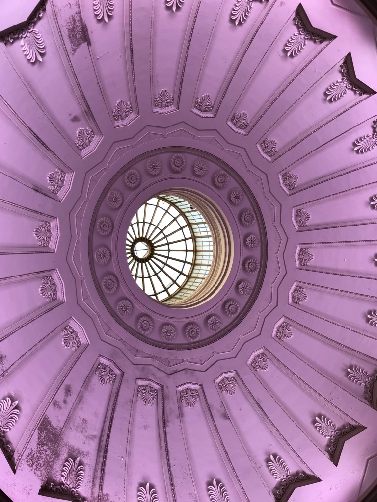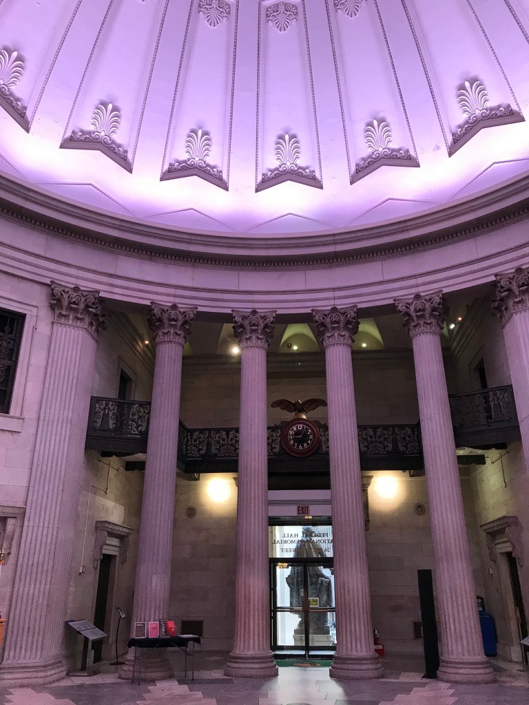- L’actuel bâtiment de style néo-grec (mouvement architectural de la fin du XVIIIe siècle et du début du XIXe siècle), conçu par Pierre-Charles L’Enfant, un architecte franco-américain, a été achevé en 1842. Il abritait un bureau des douanes (US Custom House) dont vous trouverez encore quelques vestiges et notamment des coffres.