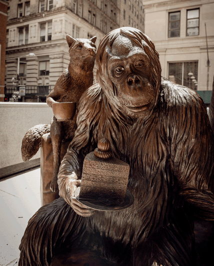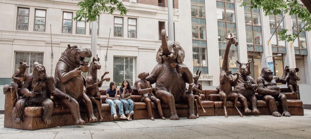 Je vous présente cette nouvelle exposition, intitulée The Wild Couch Party, des artistes britanniques bien connus Gillie et Marc, engagés dans la cause animale et auteurs déjà de merveilleuses sculptures comme le gorille à Hudson yards, les 3 derniers rhinocéros blancs sur Astor Place et l’exposition récente à côté de l’oculus,