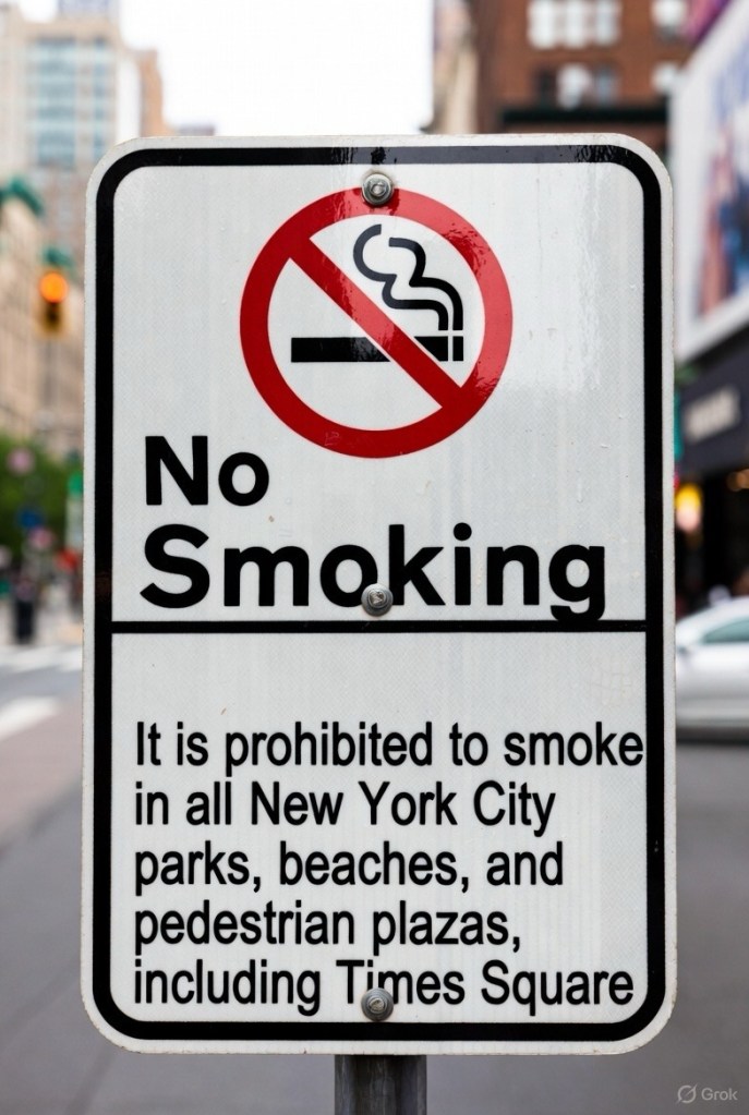 • Interdictions : Fumer est interdit dans la plupart des lieux publics fermés (restaurants, bars, bureaux, musées, théâtres, transports en commun) et dans de nombreux espaces extérieurs comme les parcs, plages, piscines et zones piétonnes (ex. Times Square).